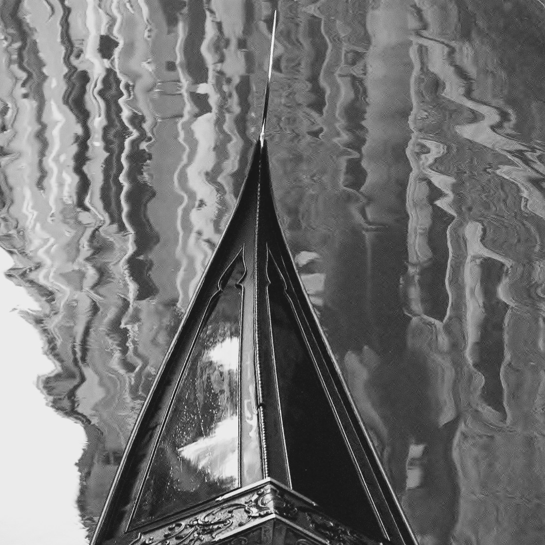 Front tip of a gondola at a canal in Venice with reflections in the water