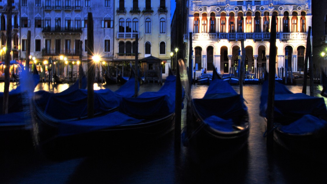 Gondolas at the Grand Canal after sunset. Venice, Italy.
