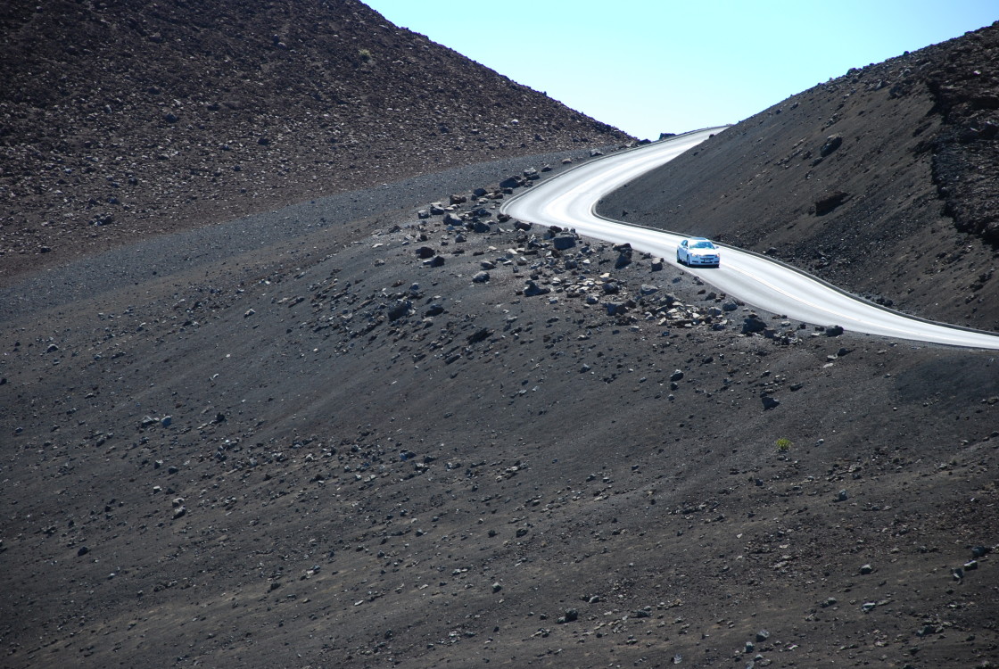 A car driving on the road down the Haleakala volcano, Maui, Hawaii.