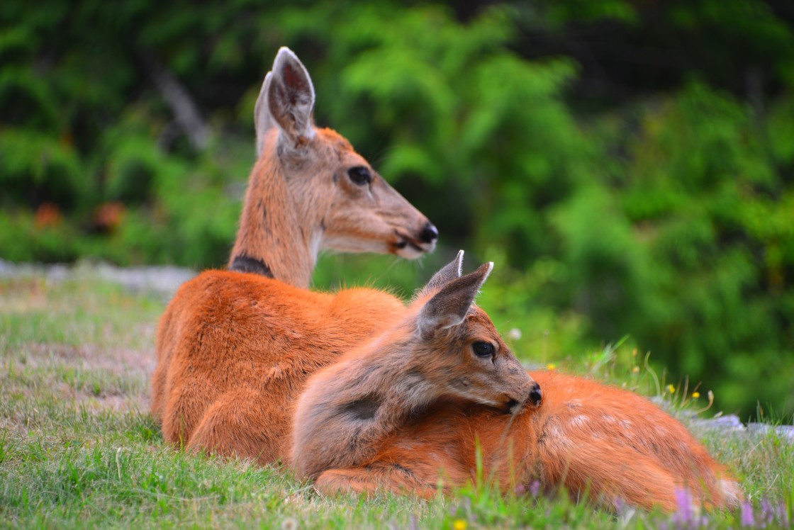 Mother and baby deer relaxing but alert, resting at a grassy clearing. Ucluelet, BC