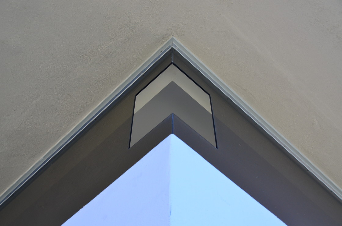 Inside the main exhibition space part of the glass of some windows have been cut out at the Museum of Contemporary Art, San Diego, CA
