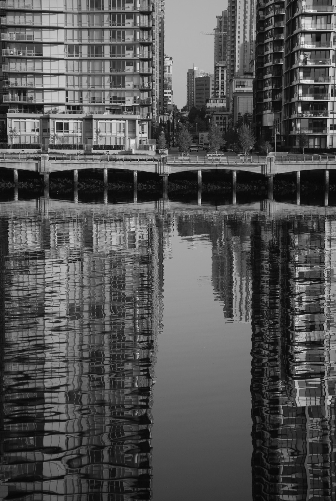 Reflection in the waters of False Creek of hi-rise apartment buildings, Vancouver, BC.