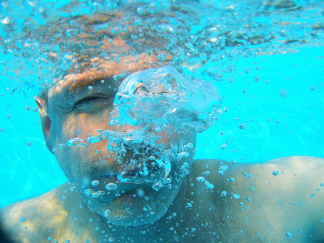 A man blowing bubbles under water in a swimming pool.