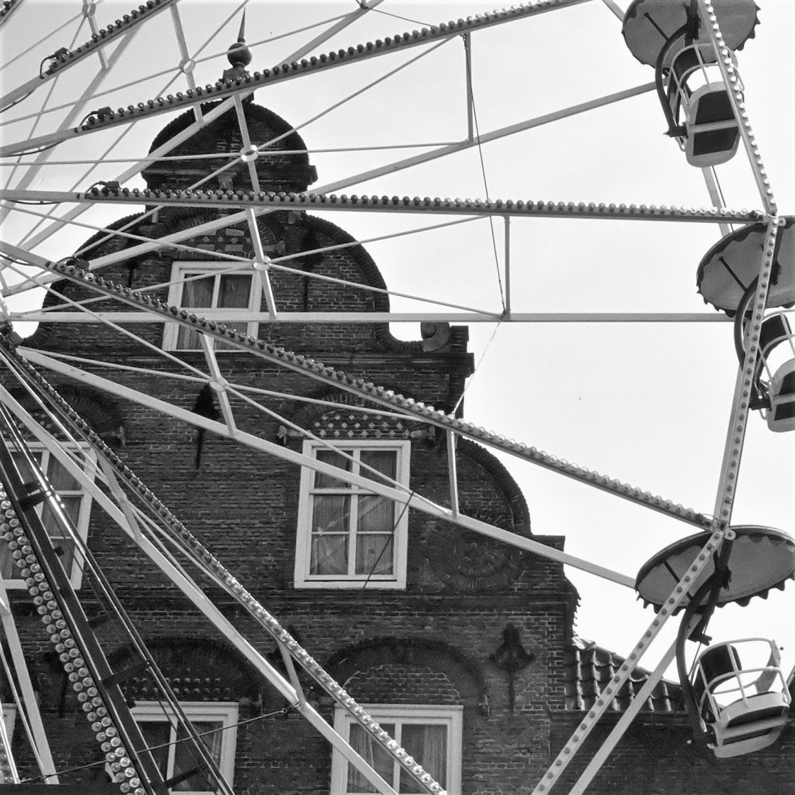 Ferris wheel with old building façade. Netherlands, 1980's, B&W conversion of color slide.