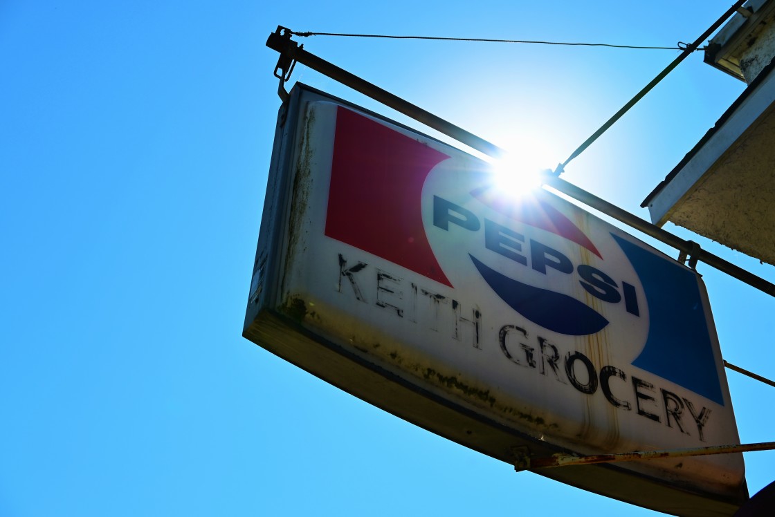Sun shines on Keith Grocery sign, Vancouver, BC